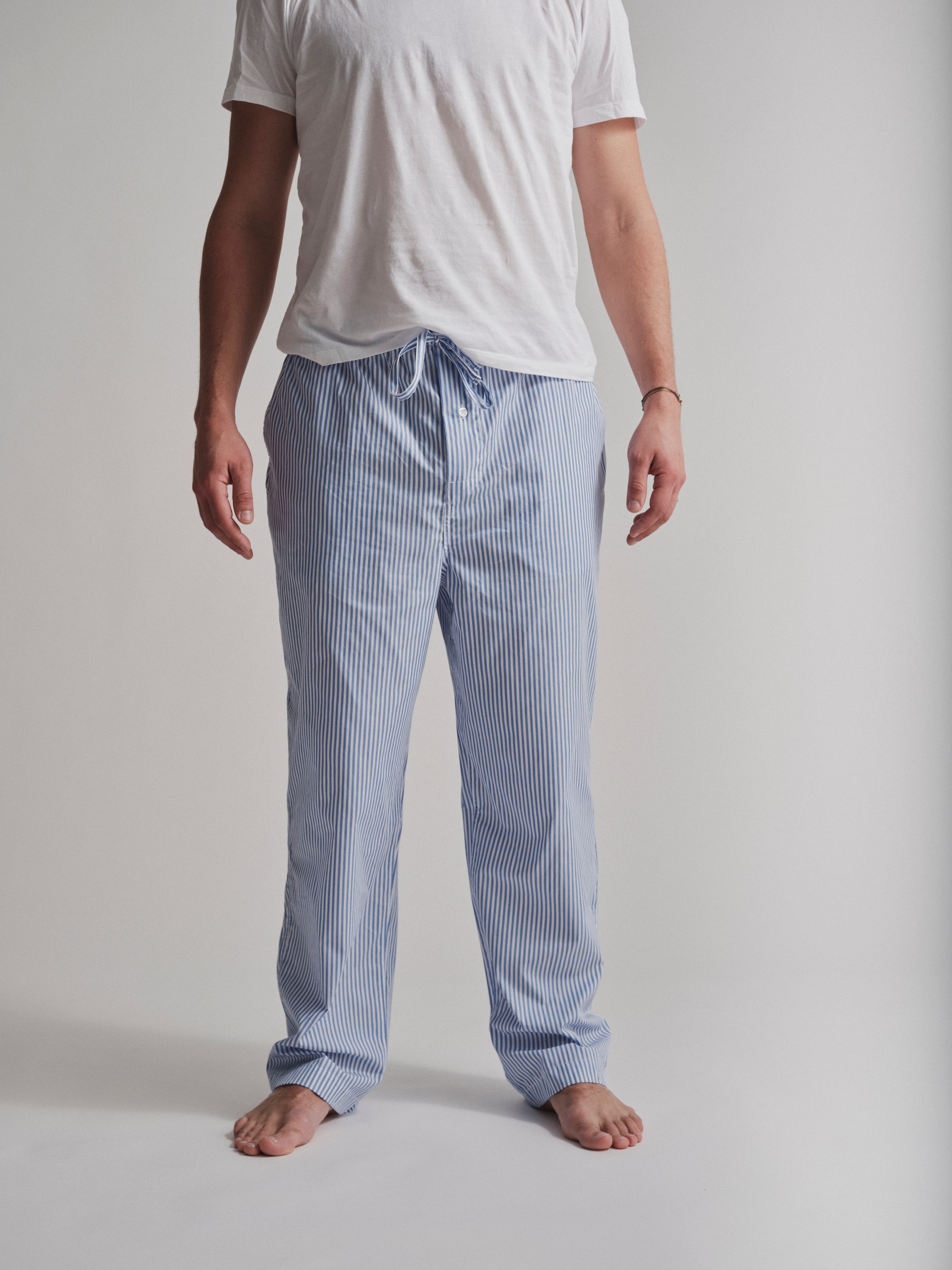 The pants have side pockets, elastic waistband in the back and with a cotton tie string and piping cuff detail.